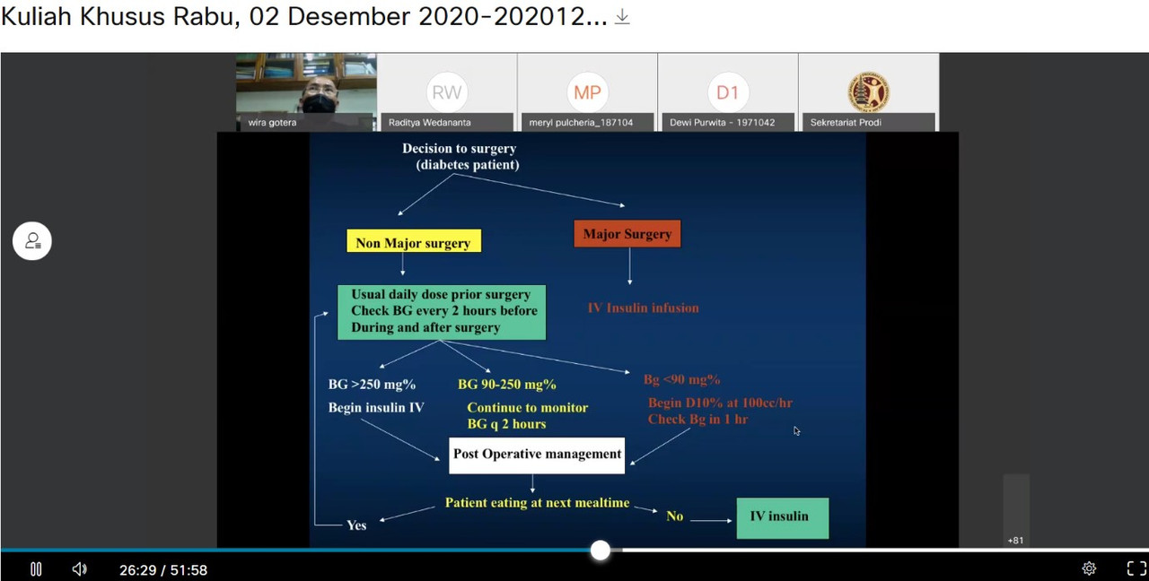 Pada hari Rabu, 2 Desember 2020, pukul 11.00 WITA, Dr. dr. Wira Gotera, Sp.PD-KEMD memberikan kuliah khusus endokrin yang diadakan secara daring. Acara ini dihadiri oleh segenap residen penyakit dalam FK UNUD/RSUP Sanglah Denpasar. Kuliah pada siang hari ini bertajuk “Hiperglikemia pada Perioperatif ” yang dipandu oleh moderator dr. I Made Siswadi Semadi, M.Biomed, Sp.PD.