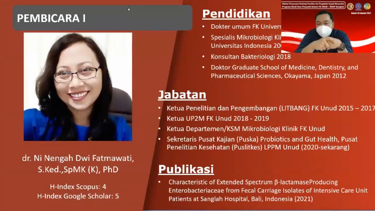 Kegiatan penelitian dan pengabdian kepada masyarakat (P2KM) merupakan salah satu bagian dari Tri Dharma Perguruan Tinggi sebagai tugas pokok dosen yang harus dikerjakan dan menjadi komponen penting dalam proses pendidikan dokter spesialis.Penyusunan roadmap P2KM yang ringkas, jelas, terukur, dan strategi hilirisasinya perlu dilakukan dalam rangka mencapai target dalam rencana kerja Program Studi Ilmu Penyakit Dalam. Kegiatan Webinar Penyusunan Peta Jalan Penelitian dan Pengabdian Masyarakat Program Studi Spesialis Ilmu Penyakit Dalam Universitas Udayana 2021 diselenggarakan secara daring (online) yang diadakan selama satu hari, yakni pada tanggal 28 Januari 2021. Dalam kegiatan webinar ini, terdapat dua materi yang dipaparkan. Materi pertama dibawakan oleh dr. Ni Nengah Dwi Fatmawati, S.Ked., SpMK (K), Ph.D, membahas bagaimana alur penyusunan roadmap penelitian dan Materi II oleh Ir. I Nengah Sujaya, M.Agr.Sc., PhD., yang membahas strategi hilirisasi dan cara pengukuran atau penetapan tingkat kesiapterapan teknologi. Berjalannya proses webinar secara daring ini tidak mengurangi esensi dan informasi yang didapatkan dari kegiatan ini. Kegiatan webinar berlangsung mulai pukul 10.00 WITA sampai dengan 13.00 WITA, dengan pemaparan materi oleh masing-masing pembicara selama 45 menit dan diikuti dengan sesi diskusi selama 15 menit. Webinar diikuti oleh 153 peserta, yang terdiri dari staf pengajar dan peserta didik Program Studi Ilmu Penyakit Dalam FK Unud/RSUP Sanglah. Roadmap P2KM dapat memberikan arah dan pedoman bagi kegiatan P2KM yang dilaksanakan, serta dapat menjadi alat bantu dalam pengukuran pencapaian kinerja serta monitoring dan evaluasi suatu kegiatan.