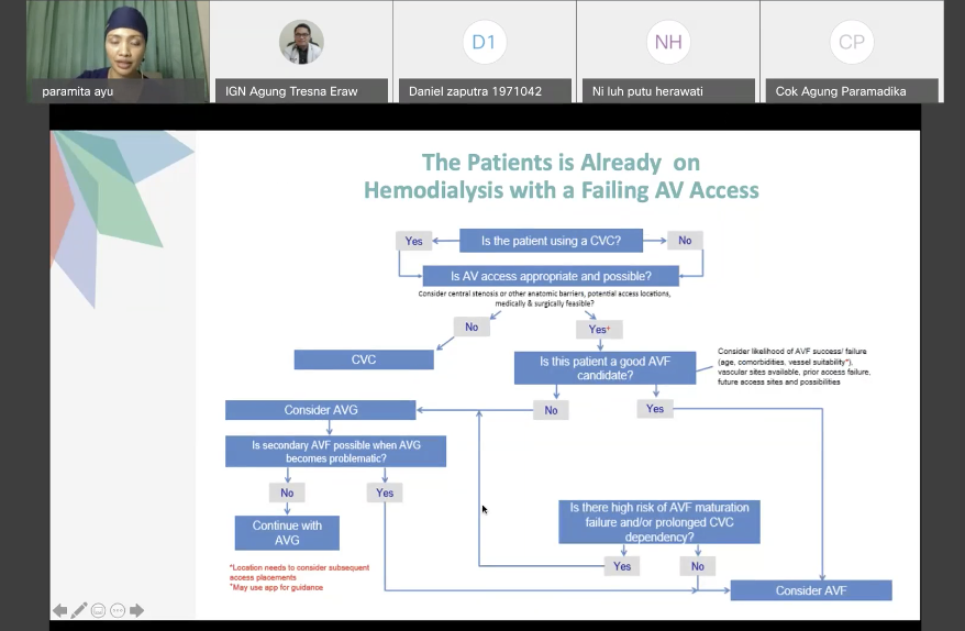 Pada Hari Rabu,19 Mei 2021, telah diberikan kuliah khusus oleh dr. Nyoman Paramita Ayu, SpPD, K-GH tentang Access Hemodialysis Infection yang diadakan secara daring melalui webex meeting. Adapun tujuan pemberian kuliah khusus ini adalah untuk mengetahui cara menangangi pasien dengan infeksi pada akses hemodialisis. Akses adalah ‘nyawa’ dalam hemodialisis, untuk itu diperlukan akes yang baik bagi pasien. Akses yang baik bergantung pada kondisi pasien itu sendiri. “Not One, Fit for All”. Akses yang baik hendaknya memiliki risiko komplikasi infeksi yang rendah.